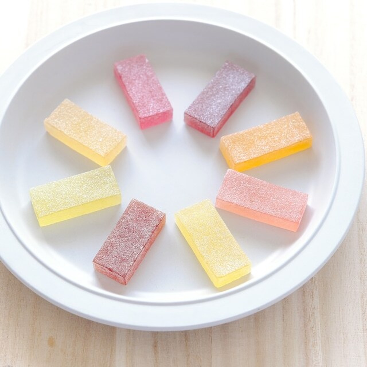 - ■しゃりしゃりらむね:砂糖(国内製造)、コンスターチ/酸味料、重曹、香料 ■くだもの詩:水飴(国内製造)、砂糖、果汁(りんご、ぶどう、いちご、もも、うめ、ざくろ、あんず、ゆず)、粉末オブラート(でん粉)/ゲル化剤(ペクチン)、酸味料、香料、着色料(アカキャベツ、紅花黄、紅麹、くちなし)、レシチン(大豆由来) ※本製品は小麦・乳・卵を含む製品と共通の設備で製造しております。