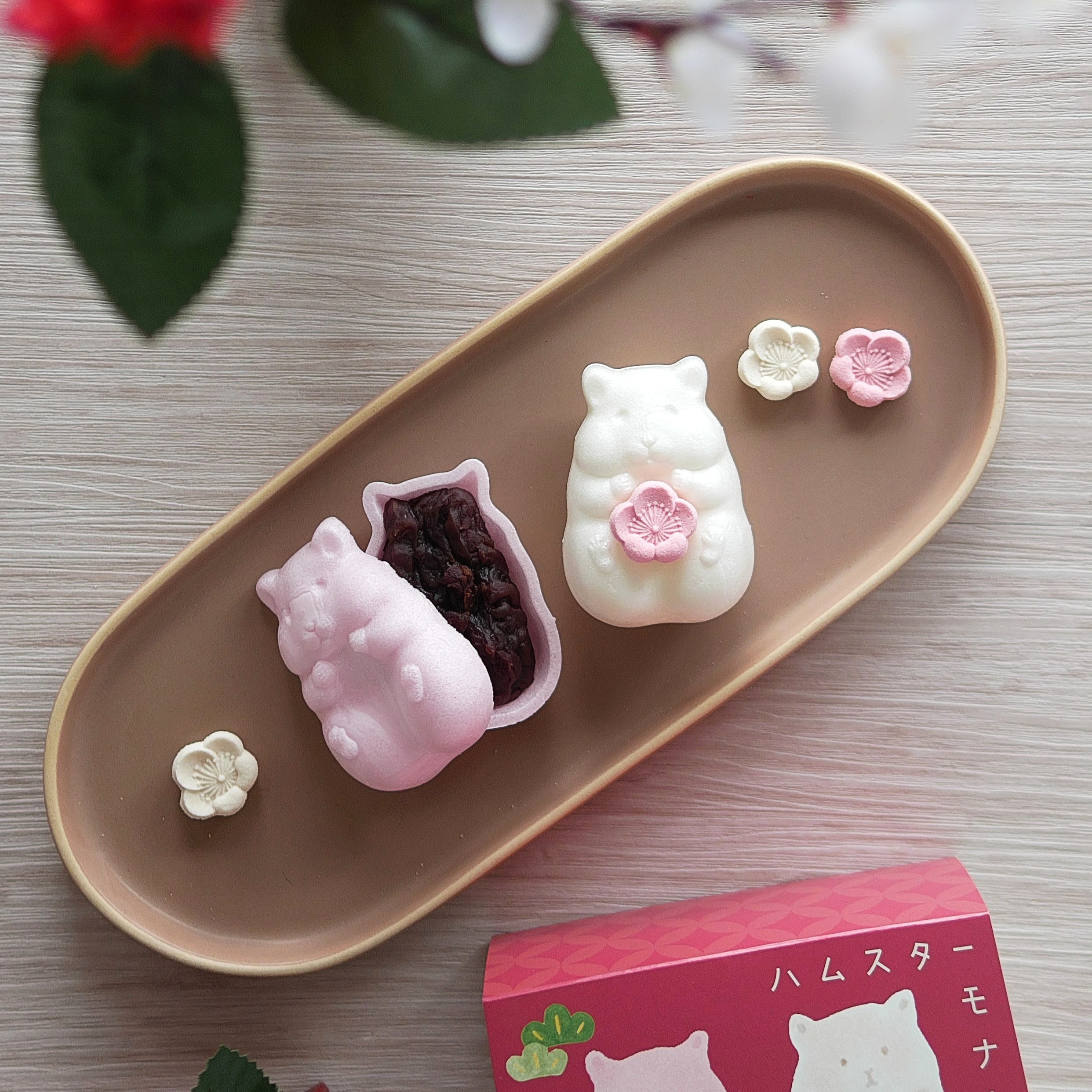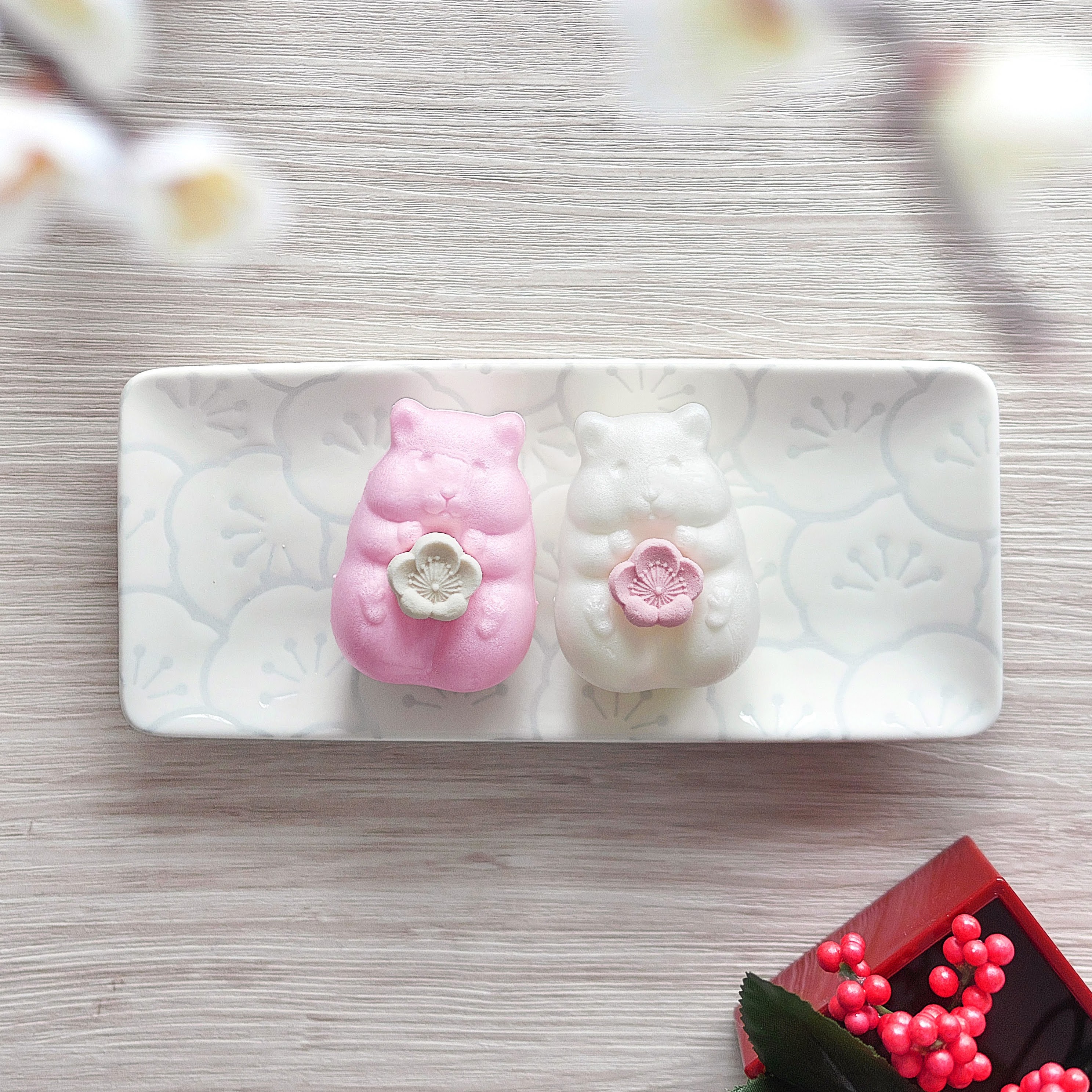 あっさりとした甘さの北海道産つぶ餡を、おなかにそっと詰めて仕上げる手作りモナカ。ハムスターのおなか部分にはくぼみがあり、付属のらくがんを添えると、まるで梅の花を抱えているような愛らしい姿に。