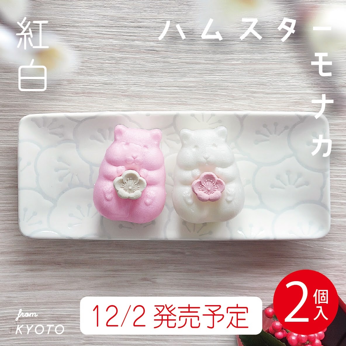 その商品のお祝いにピッタリの梅の花をもったハムスターモナカ紅白2個入りが登場!