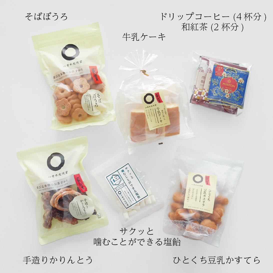 - ■牛乳ケーキ:鶏卵(国産)、小麦粉、砂糖、植物油脂、ぶどう糖、牛乳、還元水飴、洋酒、加糖練乳/ソルビトール、乳化剤、膨張剤、香料、酸化防止剤(トコフェロール)、(一部に卵・小麦粉・乳成分・大豆を含む) ■ひとくち豆乳かすてら:鶏卵(国産)、小麦粉、砂糖、食用植物油脂、豆乳、水あめ、マーガリン、こんにゃく粉、油脂加工食品、食用風味油/加工でん粉、膨張剤、乳化剤、香料、着色料(カロテン)、(一部に小麦・卵・乳成分・大豆を含む) ※本製造工場ではバナナを含む製品を製造しております。 ※まれに製品表面に原料の黒い焦げがついている場合があります。 ■手造りかりんとう:小麦粉(国内製造)、糖類(砂糖、水飴、黒砂糖)、植物油脂、ごま、ショートニング、粉末鶏卵、大豆たん白、食塩、イースト/カラメル色素、膨脹剤※本製品工場では、落花生・そば・乳製分・かにを使用した製品を製造しています。 ■サクッと噛むことができる塩飴:砂糖(国内生産)、水飴、食塩(京都産)/重曹 ※本製造ラインでは乳成分、大豆、胡麻を使用した製品も製造しています。 ■ドリップコーヒー:【フレンチロースト】コロンビア産、ブラジル、他 【モカブレンド】エチオピア、コロンビア、他 ■京の和紅茶 京 (みやこ):紅茶(京都産)