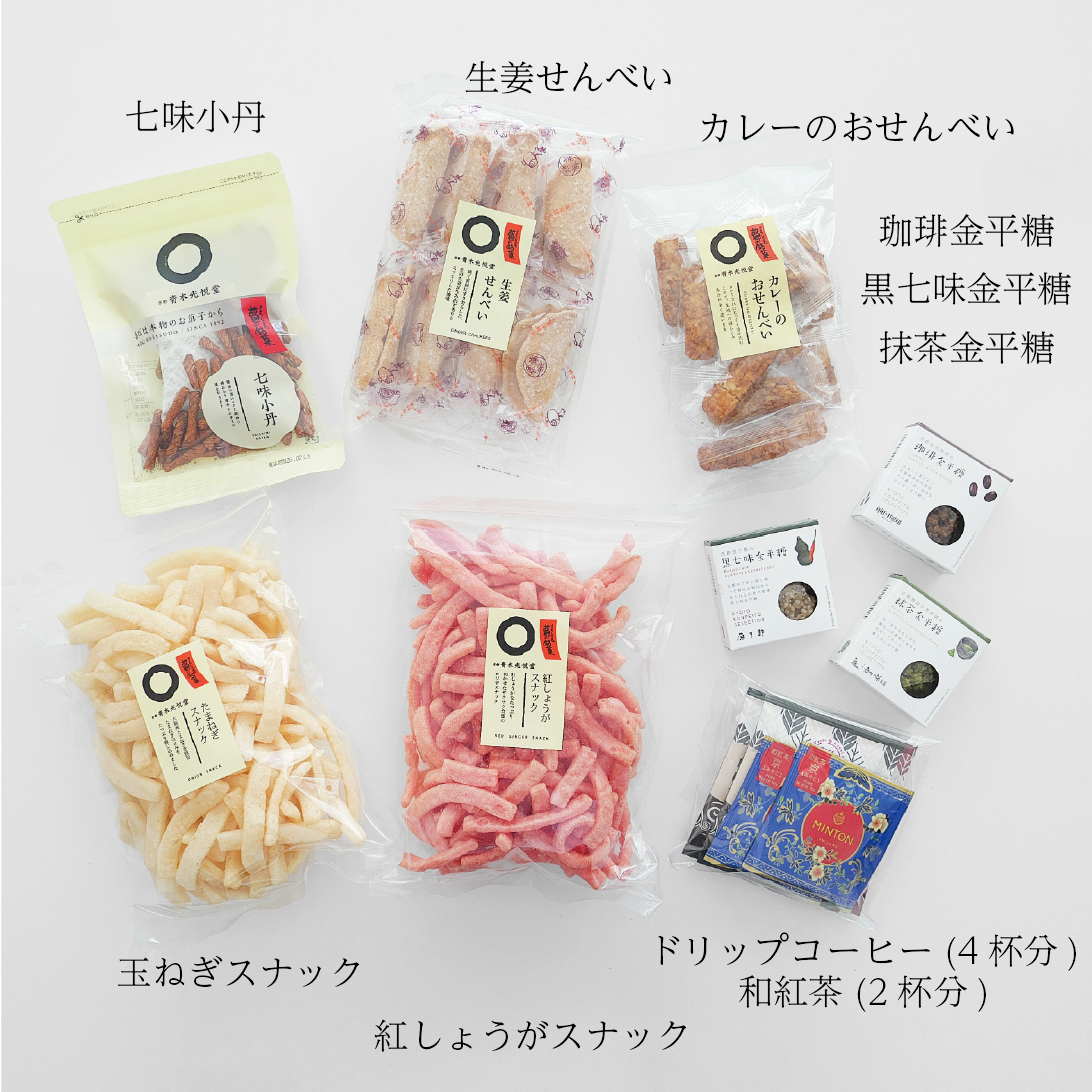 - ■たまねぎスナック:小麦粉(国内製造)、コーンスターチ、植物油、たまねぎ(大阪産)、砂糖、ビーフパウダー、食塩、オニオンパウダー、ガーリックパウダー、ビーフオイル/加工デンプン、膨張剤、調味料(アミノ酸等)、甘味料(ステビア)、酸味料(一部に小麦・牛肉・鶏肉・ゼラチン・大豆を含む) ※本品製造工場では、卵、乳成分、小麦、落花生、えび、かに、ゴマ、いかを含む製品を製造しています。■紅しょうがスナック:小麦粉(国内製造)、コーンスターチ、植物油、生姜シーズニング(ジンジャー末、食塩、たんぱく加水分解物、その他)、砂糖、食塩、生姜パウダー/加工デンプン、膨張剤、着色料(紅麹)、調味料(アミノ酸等)、香辛料抽出物)、甘味料(スクラロース)、リン酸三カルシウム ※本品製造工場では、卵、乳成分、小麦、落花生、えび、かに、ゴマ、いかを含む製品を製造しています。 ■七味小丹 :水稲もち米(国産)、たまり醤油(大豆・小麦を含む)、砂糖、デキストリン、唐辛子、かつおぶしエキス、こんぶエキス、七味唐辛子(ごまを含む)/カラメル色素■カレーのおせんべい :うるち米(国産)、カレーたれ(砂糖、しょうゆ、水あめ、デキストリン、ウスターソース、香辛料、醸造酢、ホエイパウダー、植物油脂、食塩、風味調味料(かつお)、オニオンエキス)、植物油脂、黒コショウ/増粘剤(加工でん粉)、調味料(アミノ酸等)、トレハロース、乳化剤、カラメル色素、香料、(一部に小麦・乳成分・大豆・りんごを含む) ※本品製造工場では、卵、落花生、えび・かにを含む製品を生産しています。■生姜せんべい:砂糖(国内製造)、小麦粉、卵、生姜、食塩/膨張剤 ※同工場内で落花生・大豆・乳成分を含む製品を製造しております。■京都前田珈琲の珈琲金平糖:グラニュー糖(国内製造)、コーヒー、 コー ヒー粉末■京都原了郭の黒七味金平糖 :グラニュー糖(国内製造)、黒七味■京都舞妓の茶本舗の抹茶金平糖 :グラニュー糖(国内製造)、抹茶■ドリップコーヒー:【フレンチロースト】コロンビア産、ブラジル、他 【モカブレンド】エチオピア、コロンビア、他 ■京の和紅茶 京 (みやこ):紅茶(京都産)