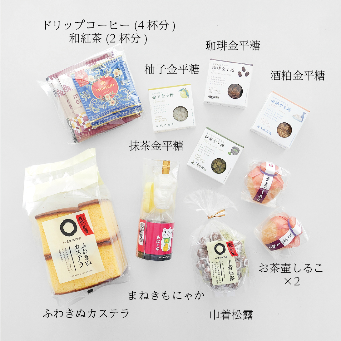 - ■まねきもにゃか:最中種(招き猫) ◇もち米(国産)、最中種(百両小判)もち米(国産)/着色料(黄4) ◇北海粒餡:砂糖(国内製造)、小豆(北海道産)/グリシン ※本製品の製造工場では、卵・小麦・そば・落花生・乳成分・くるみを使用した製品を製造しております。■巾着松露:生あん(いんげん豆、小豆、えんどう豆)(国内製造)、砂糖、水飴、寒梅粉■お茶壺しるこ:砂糖(国内製造)、絹こし餡、和三盆糖、澱粉、もち米/ソルビット■ふわきぬカステラ:卵(国産)、砂糖、小麦粉、植物油脂、加糖練乳、蜂蜜、異性化液糖、リキュール/ソルビット、乳化剤、膨張剤、着色料(カロチン)、卵殻カルシウム、香料、(一部に卵・小麦・乳成分・大豆を含む) ※蜂蜜を使用していますので、1歳未満の乳児には与えないでください。■京都前田珈琲の珈琲金平糖:グラニュー糖(国内製造)、コーヒー、 コー ヒー粉末■京都佐々木酒造の酒粕金平糖 :グラニュー糖(国内製造)、酒かす■京都水尾の柚子金平糖 :グラニュー糖(国内製造)、柚子粉末■京都舞妓の茶本舗の抹茶金平糖:グラニュー糖(国内製造)、柚子粉末■ドリップコーヒー:【フレンチロースト】コロンビア産、ブラジル、他 【モカブレンド】エチオピア、コロンビア、他 ■京の和紅茶 京 (みやこ):紅茶(京都産)