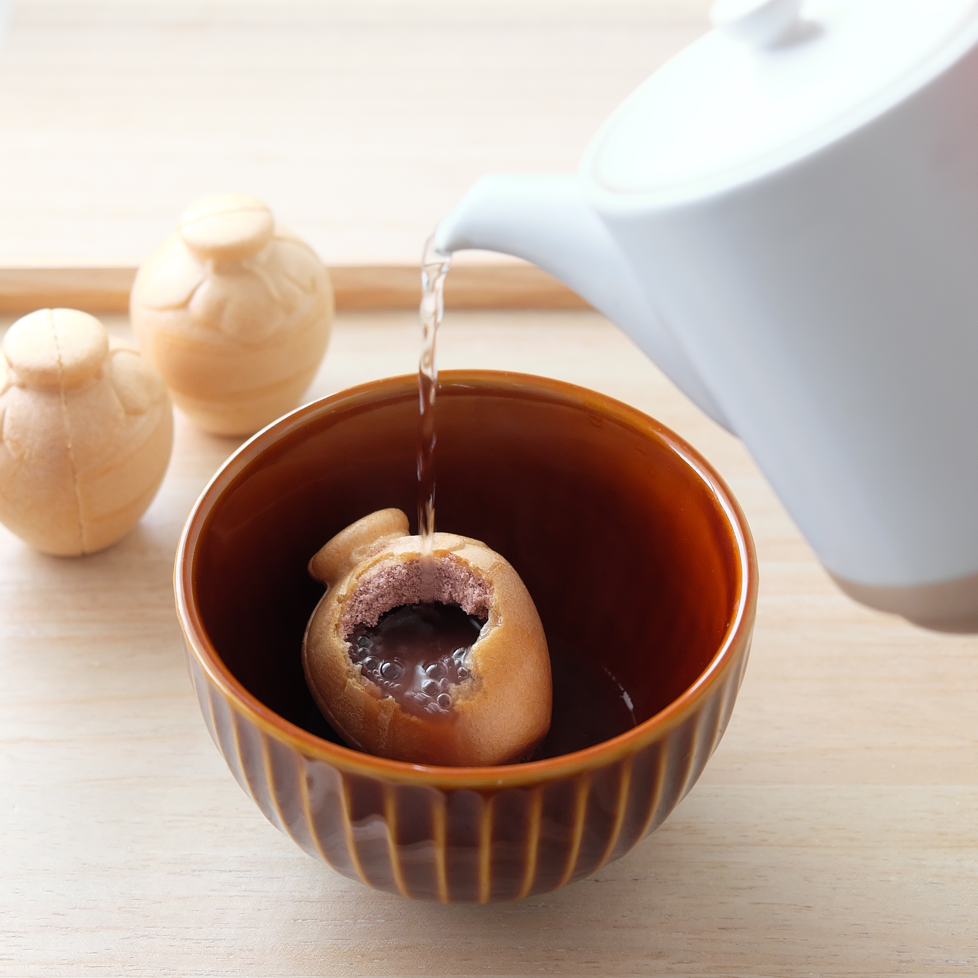 ころんと丸い形が可愛い「巾着松露」、お湯を注ぐだけでほっとする甘さが広がる「お茶壷しるこ」、