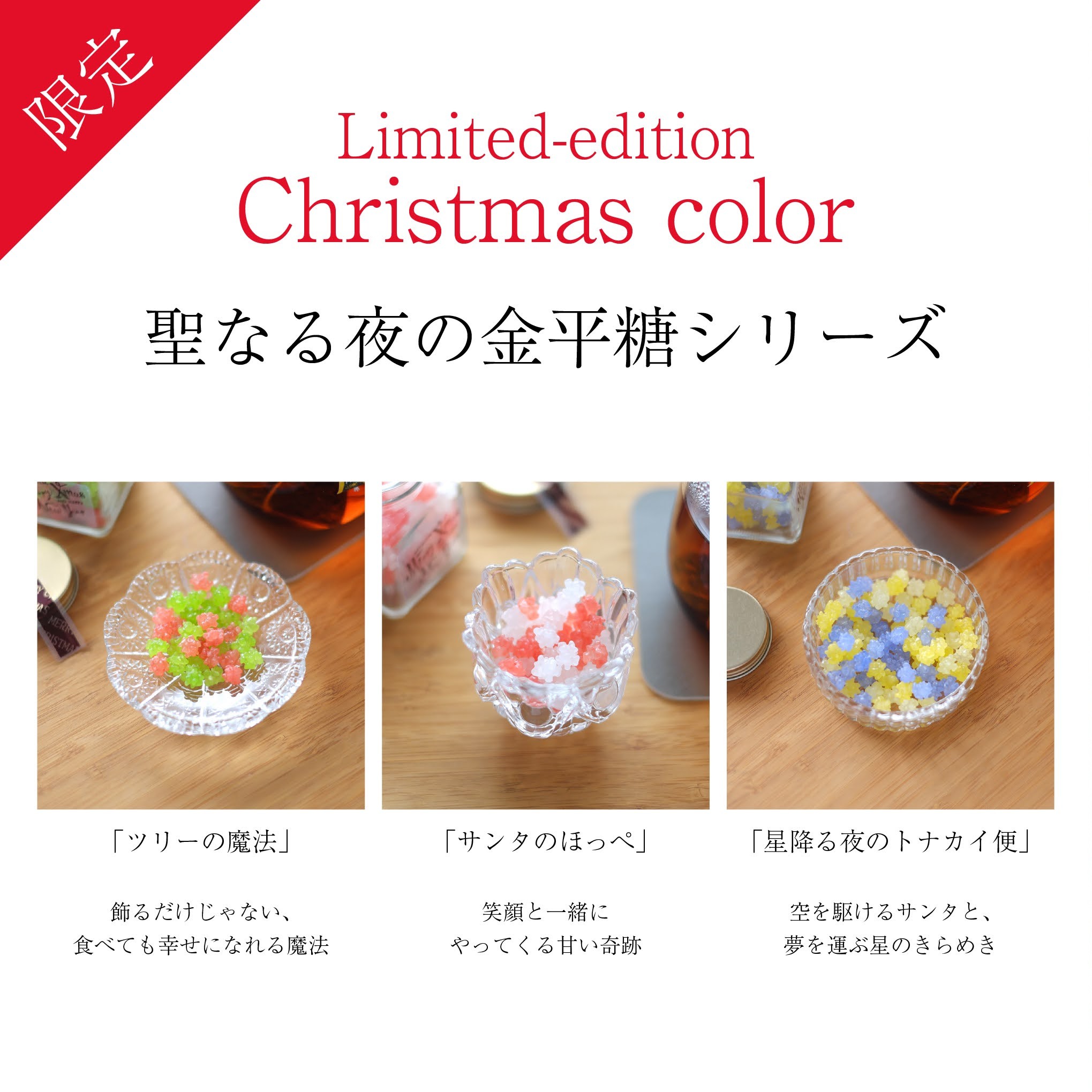 サンタの魔法で生まれた、甘くて不思議な3つの金平糖をクリスマスにお届けします。