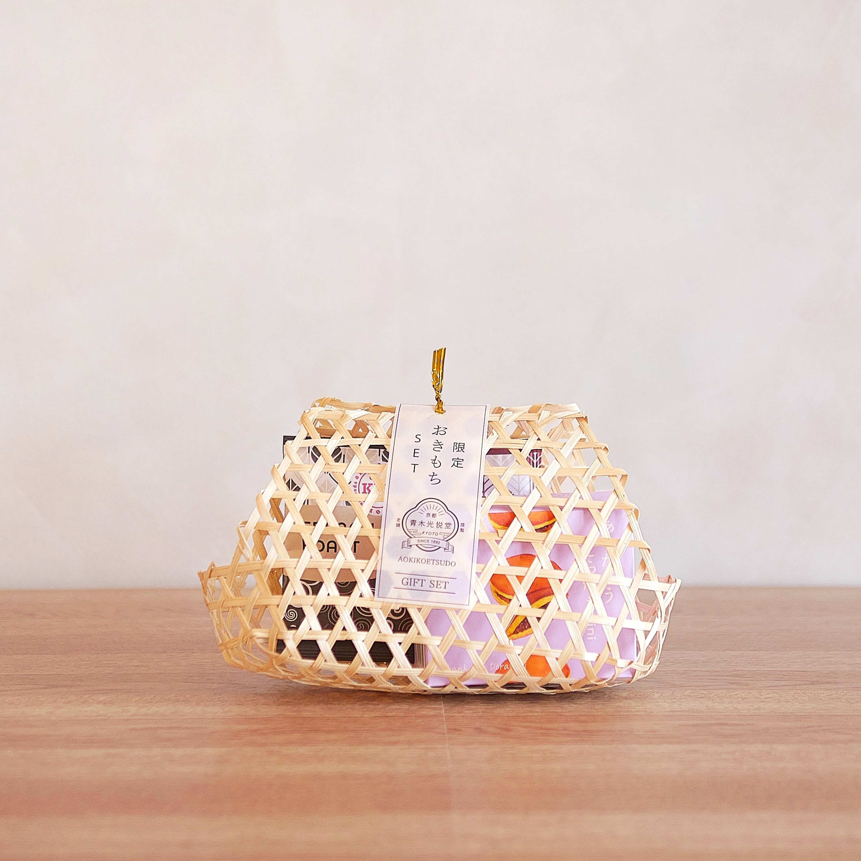 竹かごにそっと収まった「おきもちHACO」と、香りのいい和紅茶。