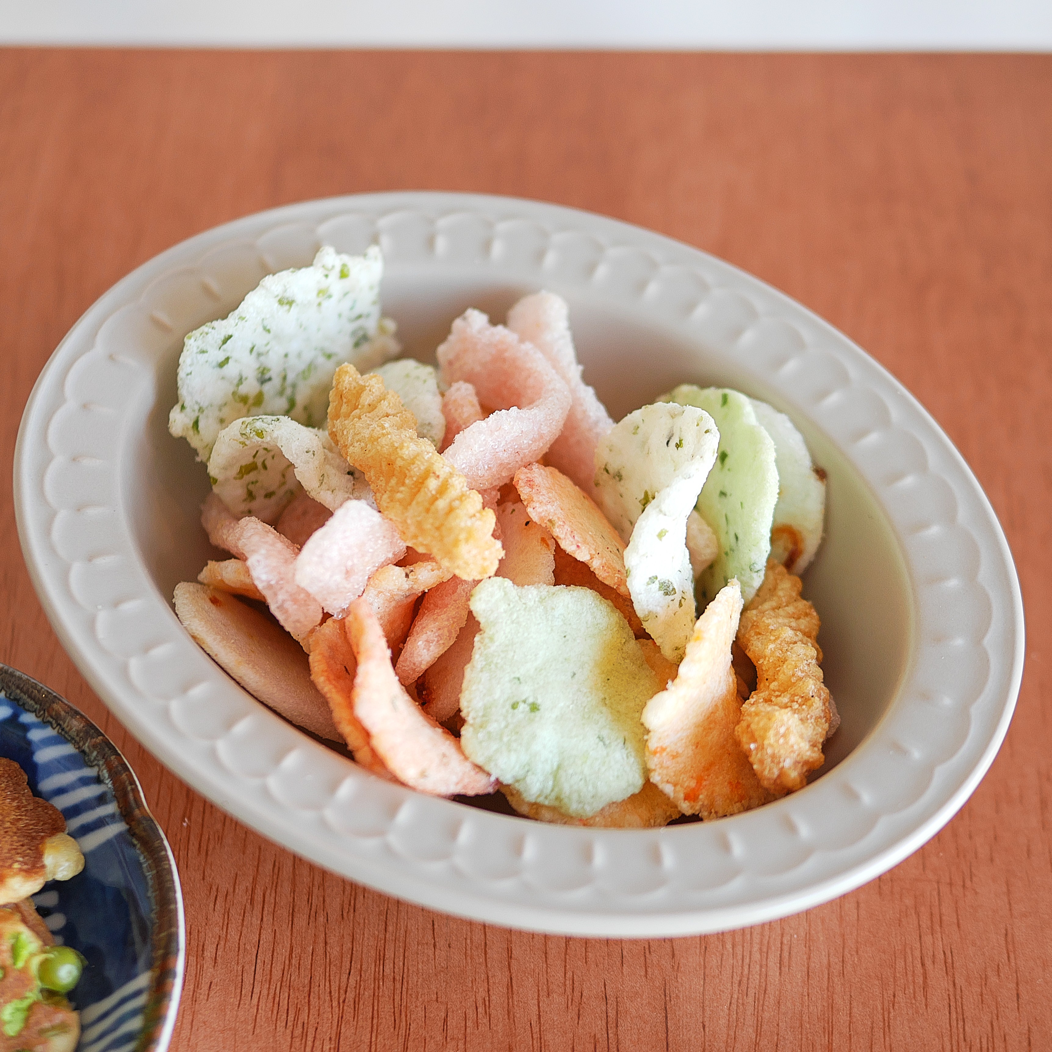 - 澱粉(国内製造)、植物油脂、えび、小麦粉、砂糖、食塩、醤油、みりん、あおさ、ツノナシオキアミ、ごま、いか、梅シーズニング、ブドウ糖、還元水飴、わさびシーズニング、蛋白加水分解物、のり、甘エビパウダー、香辛料、オキアミエキスパウダー、酵母エキスパウダー、粉末醤油、香味油、唐辛子/加工デンプン、調味料(アミノ酸等)、着色料(カロテノイド、紅麹、クチナシ、アントシアニン、カラメル)、膨張剤、香辛料抽出物、香料、リン酸Ca,微粒酸化ケイ素、酸味料、(一部にえび・小麦・乳成分・ごま・いか・大豆・さば・ゼラチンを含む。)※本品製品工場では、卵、かに、落花生を含む商品を製造しています。