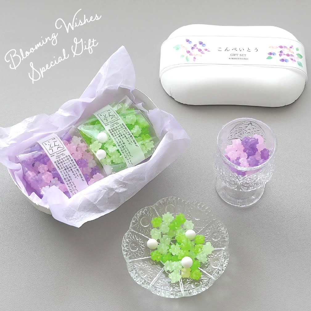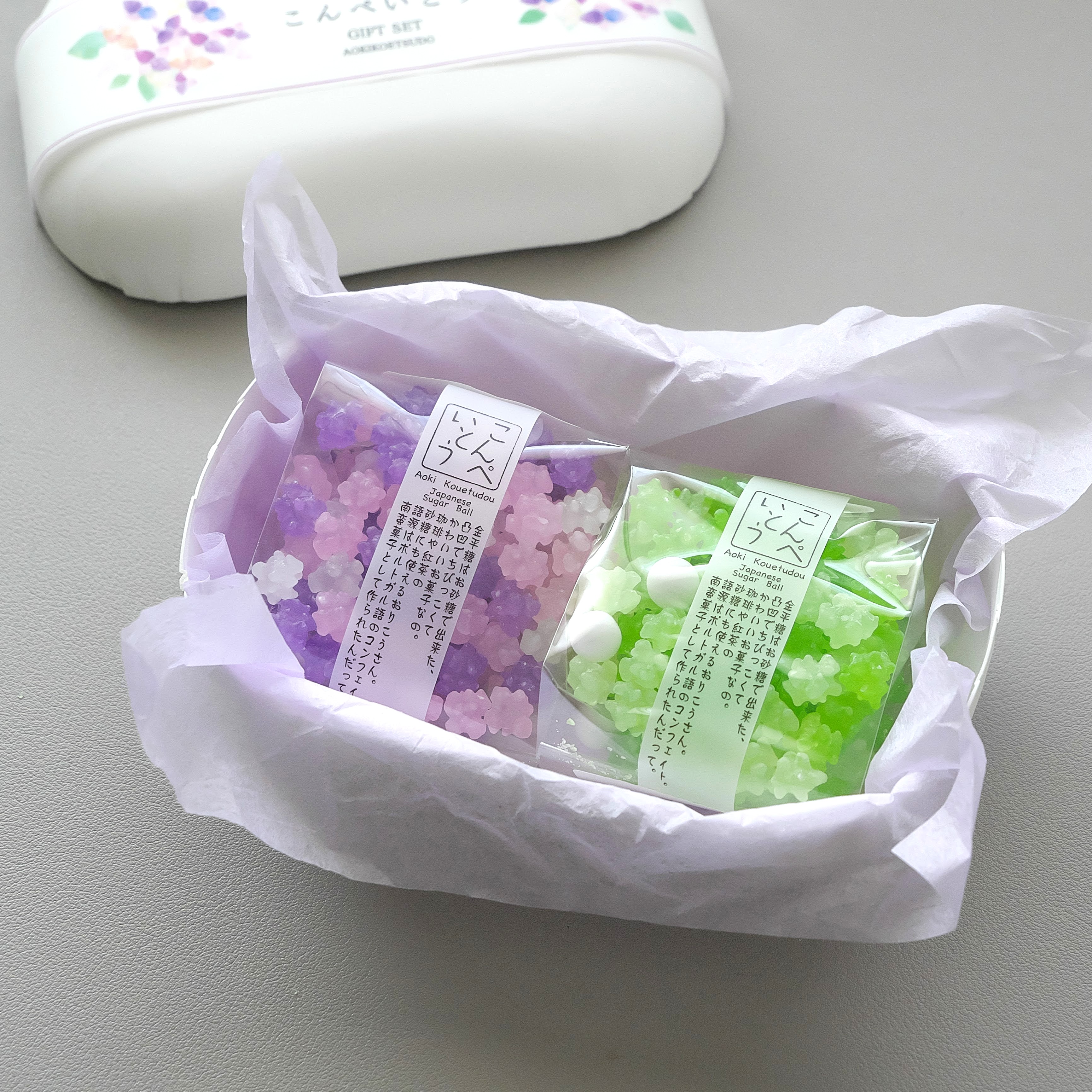 梅雨のやわらかな光を閉じ込めたような、金平糖ふじと金平糖すずらんのセット。