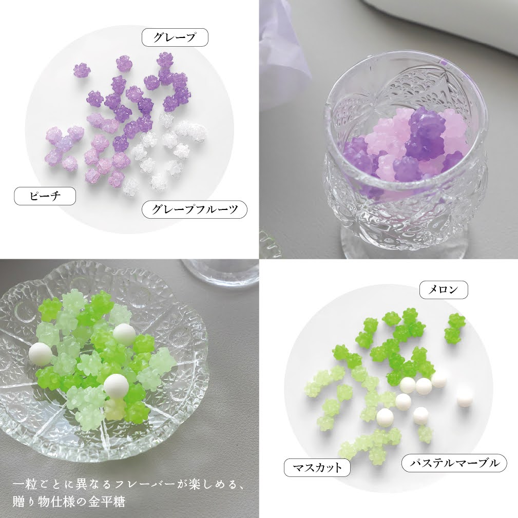 優雅で幻想的な藤の花をイメージした金平糖。グレープ・ピーチ・グレープフルーツ 3種類