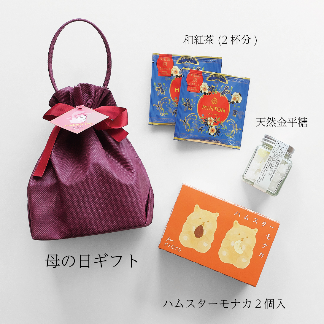 和紅茶ティーバッグ2P、ほっこり可愛いハムスターモナカ2個入り、瓶入り金平糖を巾着に詰め合わせました。